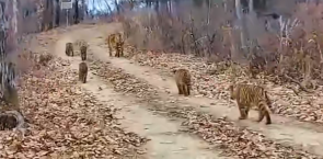 今年8月,央视新闻曾播出一只野生东北虎带着四只新生幼
