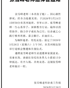 张雪峰追悼会暨遗体告别仪式今日上午7点在苏州殡仪馆举